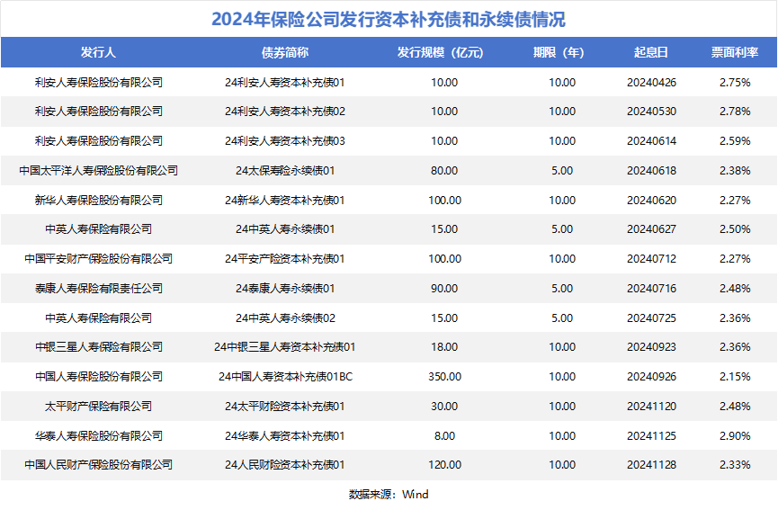 具体来看,11月28日,人保财险成功发行120亿元10年期资本补充债券,前五年票面年利率为2.33%,后五年若未赎回则升至3.33%。华泰人寿也完成了8亿元10年期资本补充债的发行,票面利率为2.9%。此外,财信人寿计划发行至多10亿元资本补充债券,期限同样为10年。