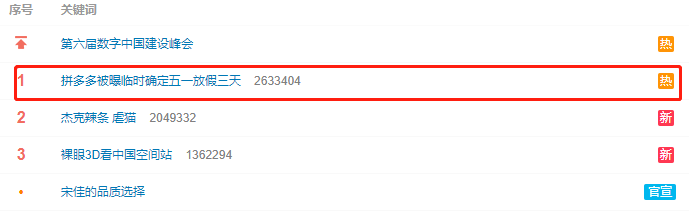 五一假期前夕,拼多多因假期安排登上热搜榜首。据报道,拼多多4月26日晚才最终确定放假三天,4月29日、5月3日需正常上班,且并无三倍工资,仅发放正常薪资。此消息引发员工不满,部分员工已预订的出行计划需全部改签。截至发稿,拼多多未对此事作出回应。