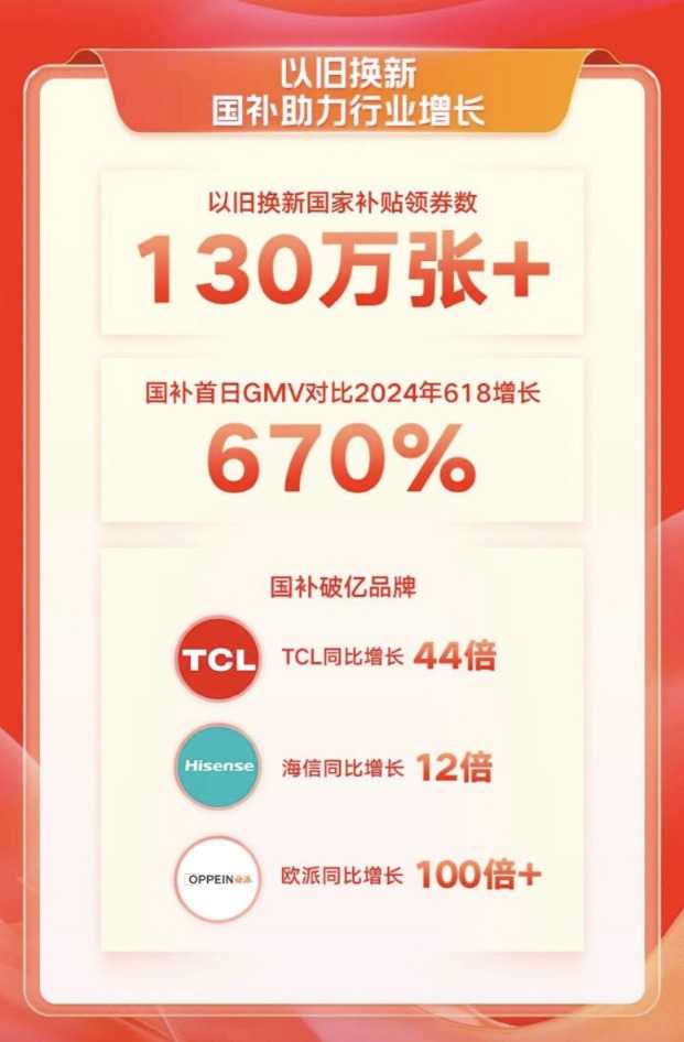 国家政策与平台的联动效应,不仅让消费者享受优惠,也为品牌带来显著销售增长。双11大促首日,TCL、海信等品牌在国补助力下实现GMV破亿,其中TCL GMV同比增长44倍,海信GMV同比增长12倍。
