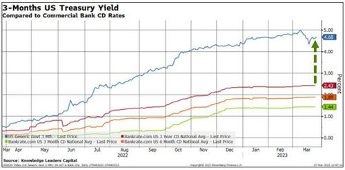 巴克莱的报告中指出,目前联邦基金利率与银行存款利率之间的差距正处于历史常态范围的最阔端,并在本轮周期内迅速扩大,这进一步加剧了存款外流的动机。同时,业内人士也指出,购买短期美债也是一个不错的选择,因为3个月美国国库券收益率与银行存单之间存在着显著的利率溢价。