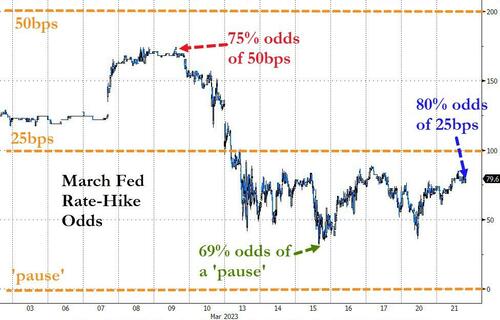 自3月初以来,联邦基金期货市场对于美联储本月加息幅度的预期经历了多次波动,从加息50个基点的预期,到银行业危机时的按兵不动甚至降息预期。而今,加息25个基点的预期再度升温。