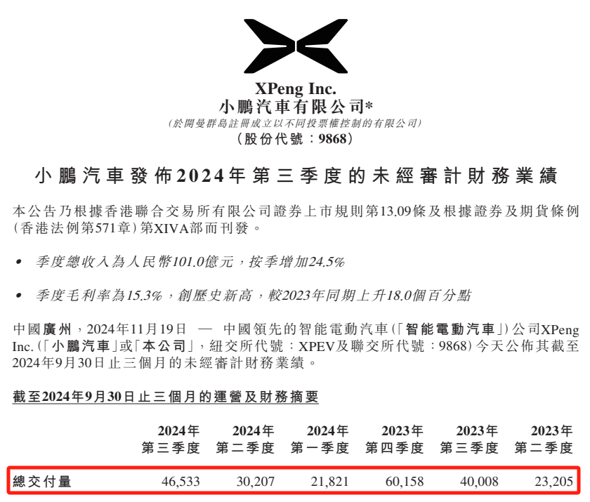 尽管最新财报显示出积极的增长趋势,但小鹏汽车仍处于亏损状态。2024年第三季度,公司净亏损为18.1亿元,相较于2023年同期的38.9亿元和2024年第二季度的12.8亿元有所收窄。这一改善主要得益于交付量的显著增长,第三季度交付量达到46533辆,同比增长16.3%。