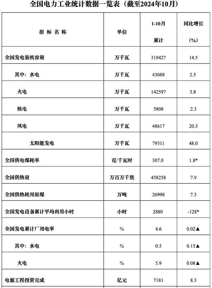 1-10月全国电力工业数据出炉:装机容量显著增长