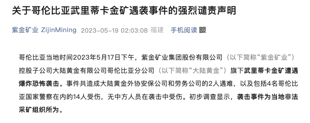 2023年5月,紫金矿业控股子公司大陆黄金旗下的武里蒂卡金矿曾遭遇爆炸恐怖袭击,造成2人遇难,14人受伤。初步调查显示,袭击事件为当地非法采矿组织所为。紫金矿业呼吁哥伦比亚当局加大对非法采矿相关暴力行为的打击力度。