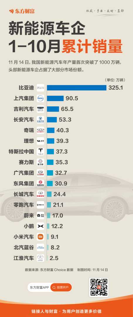 从各大新能源车企公布的最新产销数据来看,市场呈现出明显的龙头效应。比亚迪作为行业领头羊,今年1-10月的新能源汽车销量高达325.1万辆,独占鳌头,成为唯一一家年销量破百万的新能源车企。紧随其后的是上汽集团,其新能源汽车销量接近百万辆,达到90.5万辆,但这一成绩仍仅为比亚迪销量的约28%,凸显了比亚迪在行业中的强大竞争力。
