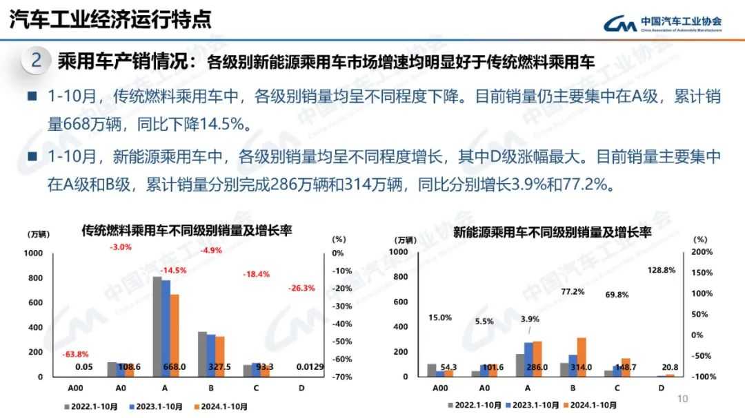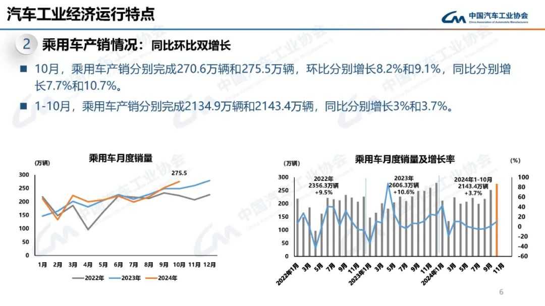 中汽协最新数据显示,2024年10月,中国汽车产销表现强劲,分别完成299.6万辆和305.3万辆,环比增长7.2%和8.7%,同比分别增长3.6%和7%。累计至10月,汽车产销总量分别达到2446.6万辆和2462.4万辆,同比分别增长1.9%和2.7%,销量增速较1-9月扩大0.36个百分点。