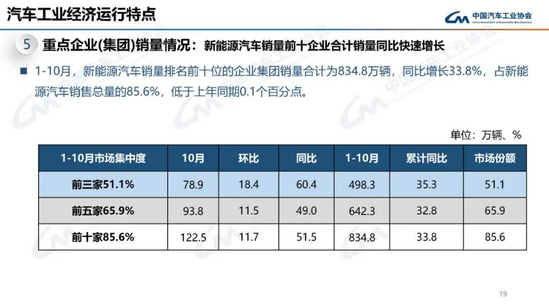 新能源汽车市场继续高歌猛进,10月产销分别为146.3万辆和143万辆,同比分别增长48%和49.6%,占当月新车总销量的46.8%。1-10月,新能源汽车产销累计达到977.9万辆和975万辆,同比分别增长33%和33.9%,占新车总销量的39.6%。