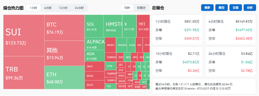 近期加密货币市场的强劲表现,让部分做空投资者遭受了重大损失。据Coinglass行情数据统计,过去24小时内,共有131771名投资者遭遇爆仓,总金额高达3.84亿美元。其中,最大单笔爆仓单发生在Binance交易所的BTCUSDT交易对中,价值高达1310.05万美元。