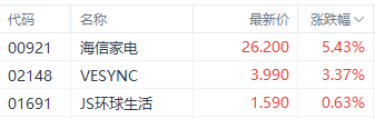 家电股方面,海信家电(00921.HK)、VESYNC(02148.HK)、JS环球生活(01691.HK)分别上涨5.43%、3.37%、0.63%。太平洋证券指出,家电销额阶段性位居“双11”全网榜首,抖音平台开门红表现亮眼。在国家和地方家电以旧换新补贴的加持下,今年“双11”家电产品的优惠力度或强于往年,对终端销售的促进作用也有望增强。