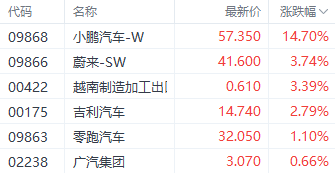 汽车股方面,小鹏汽车-W(09868.HK)领涨,涨幅达到14.70%。蔚来-SW(09866.HK)、吉利汽车(00175.HK)也分别上涨3.74%、2.79%。乘联分会秘书长崔东树表示,新能源乘用车国内销量四季度预计为355万辆,同比增长39%。
