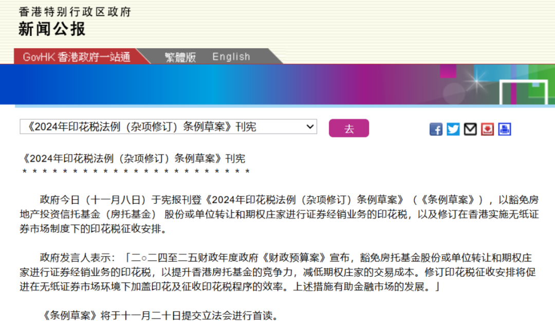 香港特区政府正式在宪报刊登《2024年印花税法例(杂项修订)条例草案》,豁免房地产投资信托基金股份或单位转让和期权庄家进行证券经销业务的印花税,并修订无纸证券市场制度下的印花税征收安排。