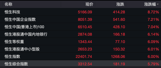 截至午盘,港股三大指数均呈现出放量大涨的态势。恒指上涨6%,刷新了自2023年1月以来的高位;恒生科技指数更是飙升8.72%,创下了2022年2月以来的新高。盘中,恒生科技指数的涨幅一度扩大至10%,市场热情高涨。