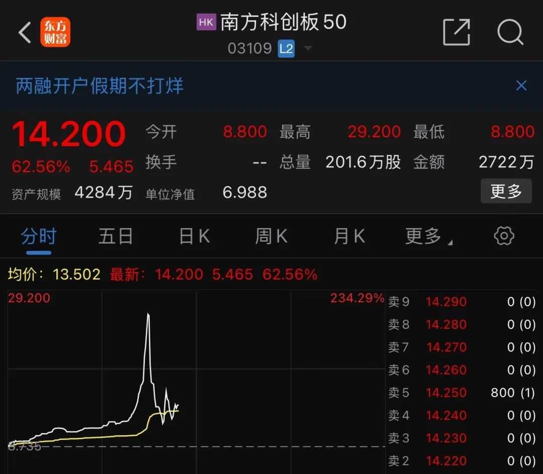 在A股未开盘的情况下,资金纷纷通过港股ETF进行提前布局。港交所上市的科创50ETF——南方科创板50表现尤为抢眼,盘中涨幅一度扩大至230%,成为市场关注的焦点。