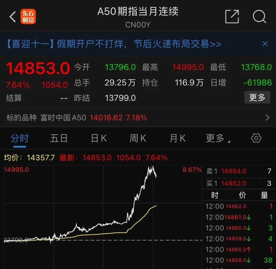 此外,富时中国A50指数期货也表现出色,盘中涨幅扩大至8%,逼近15000点大关,创下了自2022年7月6日以来的新高。