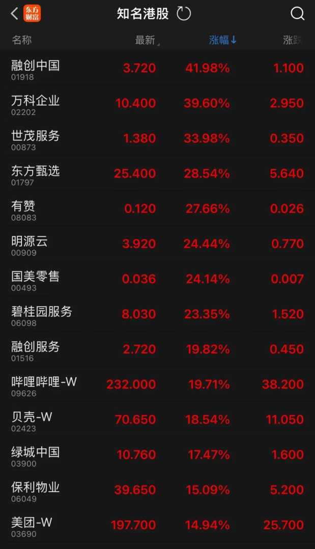 众多知名港股纷纷暴涨。地产股中,融创中国、万科企业、世茂服务等均涨幅超过30%。同时,东方甄选、国美零售、碧桂园服务、哔哩哔哩-W、绿城中国、保利物业等个股也均涨幅超过15%,市场呈现出全面上涨的态势。