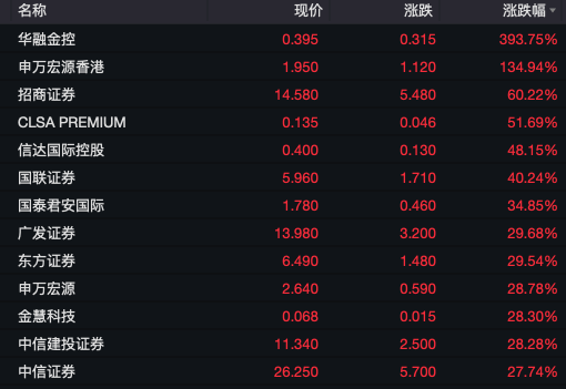 券商股更是持续飙升。截至午盘,申万宏源香港暴涨135%,招商证券大涨超60%。国泰君安国际、国联证券等个股也均涨幅超过30%,中信建投证券、中信证券涨幅超过25%,券商板块成为市场的领涨力量。