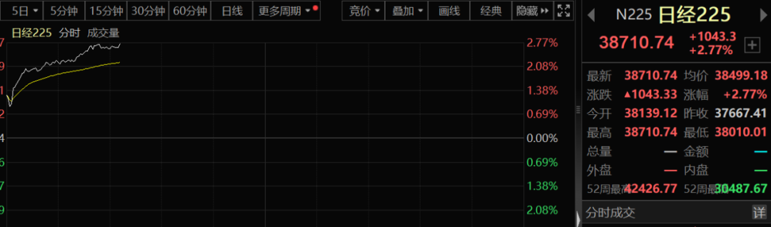 亚太股市迎来大反攻。在上周经历大幅下跌后,今日早盘亚太市场显著回暖。日经225指数大幅攀升,一度暴涨超2.7%。