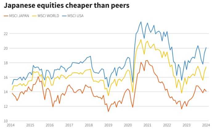 MSCI日本指数的远期市盈率仍较低。图片来源:路透社