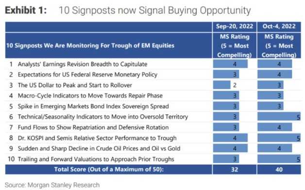 由亚洲及新兴市场首席策略分析师Jonathan Garner领衔的大摩策略团队,在报告中将亚洲(除日本外)及新兴市场的投资评级由“平配”上调至“超配”,并预测今年累计下跌26%的MSCI新兴市场指数,将在明年6月前迎来约12%的反弹。
