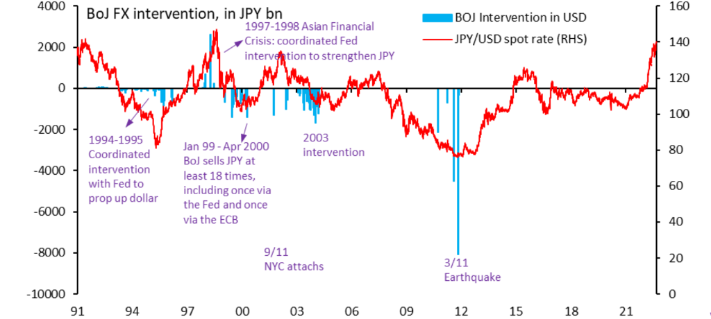 面对日元贬值风暴,日本政府终于采取行动。日本政府和日本央行进入市场买入日元,进行了自1998年6月以来的首次外汇干预。日本财务省副大臣神田真人表示,投机行为是日元近期突然、单边波动的原因,日本政府高度关注日元的过度波动,将保持高度紧迫性,密切监控外汇走势。干预后,日元汇率短线跳涨,美元兑日元汇率迅速走低。