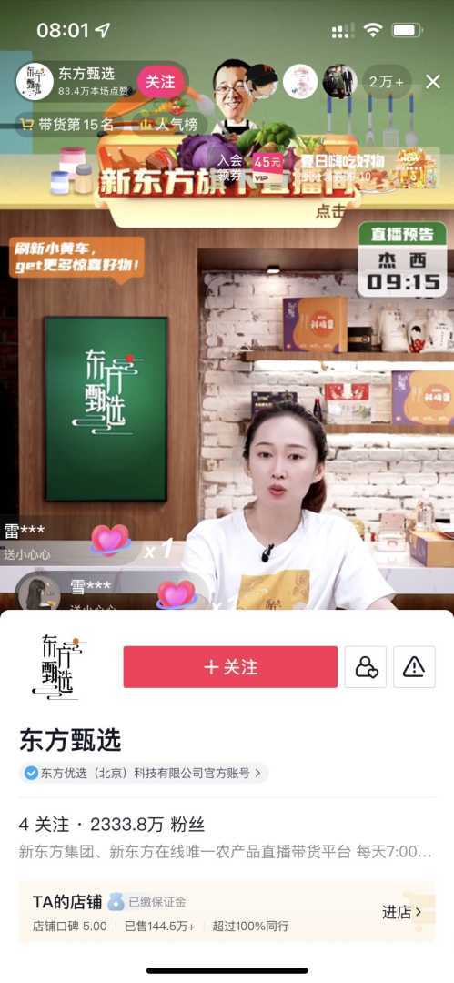 截至本季度末,新东方旗下的学校及学习中心数量已减少至744间。与此同时,新东方在线(Koolearn.com)持续拓展针对成人和大学生的在线教育服务,并积极在新领域中寻找商机。新东方在线还成立了名为东方甄选的电商平台,销售农产品及其他产品,并在抖音等短视频社交平台上开展直播活动。东方甄选取得了显著成绩,已拥有数千万订阅者和会员的广泛认可。截至发稿时,东方甄选的粉丝数量已达到2333.8万。