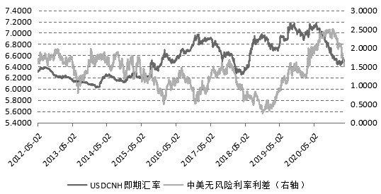图为中美国债利差和美元兑离岸人民币(CNH)汇率走势对比。