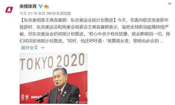 央视体育报道指出,东京奥运会和残奥会组委会主席森喜朗同样在近期表示,尽管全球新冠疫情形势依然严峻,但东京奥运会仍将按计划推进。他坚定地表示,任何犹豫都将影响全局,呼吁全社会团结一致,共同突破难关,坚信黎明终将到来。