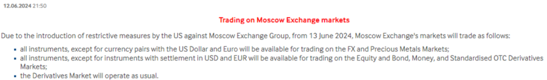莫斯科交易所发布公告称,受美国制裁影响,自2024年6月13日起,交易所将不再使用美元和欧元进行外汇和贵金属交易,同时也不再交易以美元和欧元进行结算的金融工具。但远期市场交易不受影响。莫斯科交易所表示,其拥有所有必要的工具,可在高度波动的环境中不间断地进行交易,确保金融市场基础设施的运行及交易的可靠性。