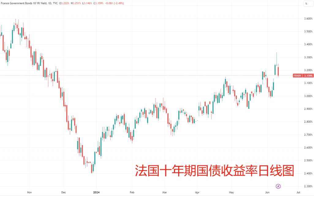 受政策前景不确定性的影响,法国十年期国债收益率在过去几天内从3%飙升至3.3%,随后在市场情绪平复和外围市场利好消息的推动下,回落至3.16%附近。法国央行行长维勒鲁瓦也强调,无论选举结果如何,法国都需要迅速明确其经济战略,特别是预算战略,因为投资者对不确定性持谨慎态度。