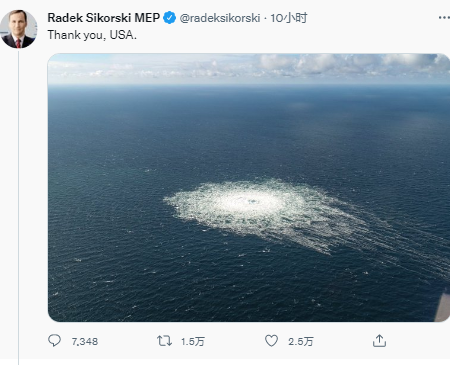 西科尔斯基在推特上发布了天然气管道泄漏现场的照片,并配文:“谢谢你,美国。”事实上,在北溪管道遭到破坏后,美国确实可能成为潜在受益方。在俄罗斯大幅减少对欧天然气供应后,欧洲天然气价格飙升,美国向欧洲出口的天然气数量大幅增加,从中赚取了巨额利润。