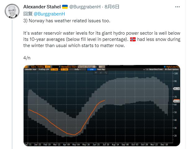 然而,随着俄罗斯削减天然气供应以反制欧洲制裁,欧洲大陆正经历几十年来最严重的能源危机,对挪威水电需求激增。但挪威国内公众和反对党要求限制电力出口的呼声日益高涨。今年夏季欧洲的干旱天气也严重影响了挪威的水电供给,南方地区水库水位急剧下降,电价屡破纪录。