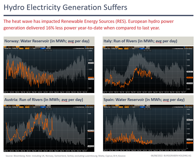欧洲多国面临类似困境,西班牙、葡萄牙和意大利等地水库和河流是低碳能源重要来源,但长期干旱几乎耗尽这些资源。欧洲热浪导致水力发电量同比减少16%,瑞士核能发电也受到严重限制。