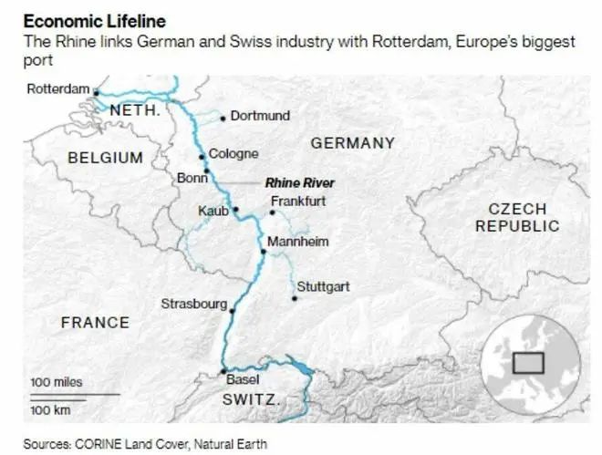 首先是,欧洲“生命线”莱茵河告急。当地时间8月2日,德国联邦水路与航运管理局公布的数据显示,莱茵河部分河段水位已降至23.6英寸(约合60厘米),创二十多年以来的同期最低水位,预计到本周六将降至18.5英寸(约合47厘米),面临断航风险。一旦断航,将导致大量煤炭、石油等能源运输面临停运风险,进一步加剧欧洲能源危机。德国30%的原油、煤炭运输都依赖内河航运,占德国货运总量的5%-10%,而德国内河航运中约80%都依靠莱茵河。