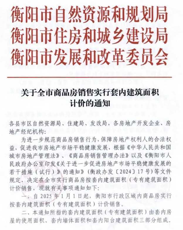 近日,湖南省衡阳市自然资源和规划局、住建局及发改委联合发布《关于全市商品房销售实行套内建筑面积计价的通知》,标志着自2025年1月1日起,衡阳市商品房销售将全面推行按套内建筑面积计价,成为湖南首个实施此政策的城市。