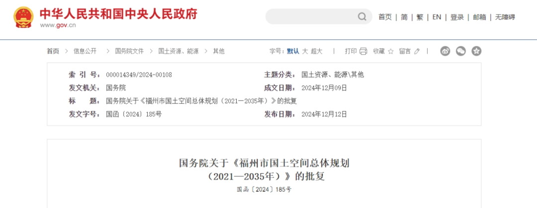 据中国政府网12月12日消息,国务院正式发布了关于《福州市国土空间总体规划(2021—2035年)》的批复文件,标志着福州市国土空间规划迈入新阶段。