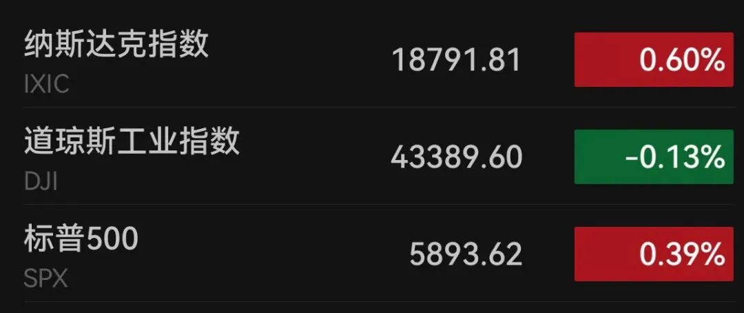 美股三大股指在11月18日的交易中涨跌互现。截至收盘,道琼斯工业平均指数下跌55.39点,跌幅为0.13%,报收于43389.60点;纳斯达克综合指数上涨111.69点,涨幅为0.60%,报收于18791.81点;标普500指数上涨23.02点,涨幅为0.39%,报收于5893.62点。纳指结束连续四日下跌,科技板块表现尤为强劲。