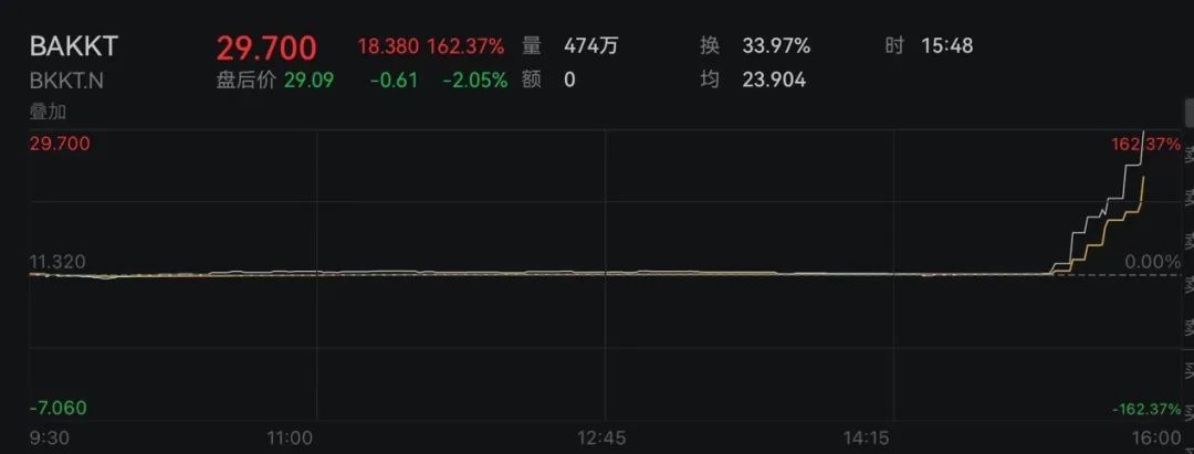 受这一消息影响,美股Bakkt股价在尾盘阶段多次触发熔断机制,最终收盘涨幅超过160%。据了解,Bakkt由洲际交易所控股55%,其加密托管业务将不包括在本次交易中。