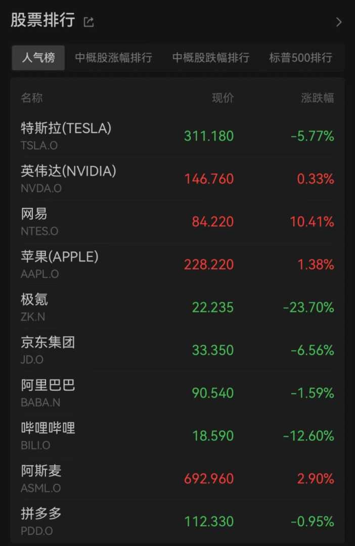 热门中概股方面,多数股票同样出现下跌。纳斯达克中国金龙指数下跌1.81%,其中极氪跌幅超过23%,文远知行跌幅超过17%,哔哩哔哩跌幅超过12%,京东集团跌幅超过6%,小鹏汽车跌幅超过5%,蔚来、贝壳等跌幅超过3%;阿里巴巴、晶科能源等跌幅超过1%。而在涨幅方面,网易涨幅超过10%,金山云涨幅超过4%,雾芯科技涨幅超过2%,爱奇艺涨幅超过2%。