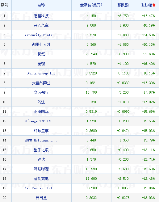领跌中概股列表: