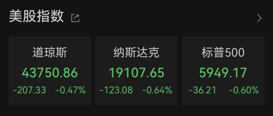 具体来看,道琼斯工业平均指数下跌207.33点,跌幅0.47%,收于43750.86点;纳斯达克综合指数下跌123.07点,跌幅0.64%,收于19107.65点;标准普尔500指数下跌36.21点,跌幅0.60%,收于5949.17点。