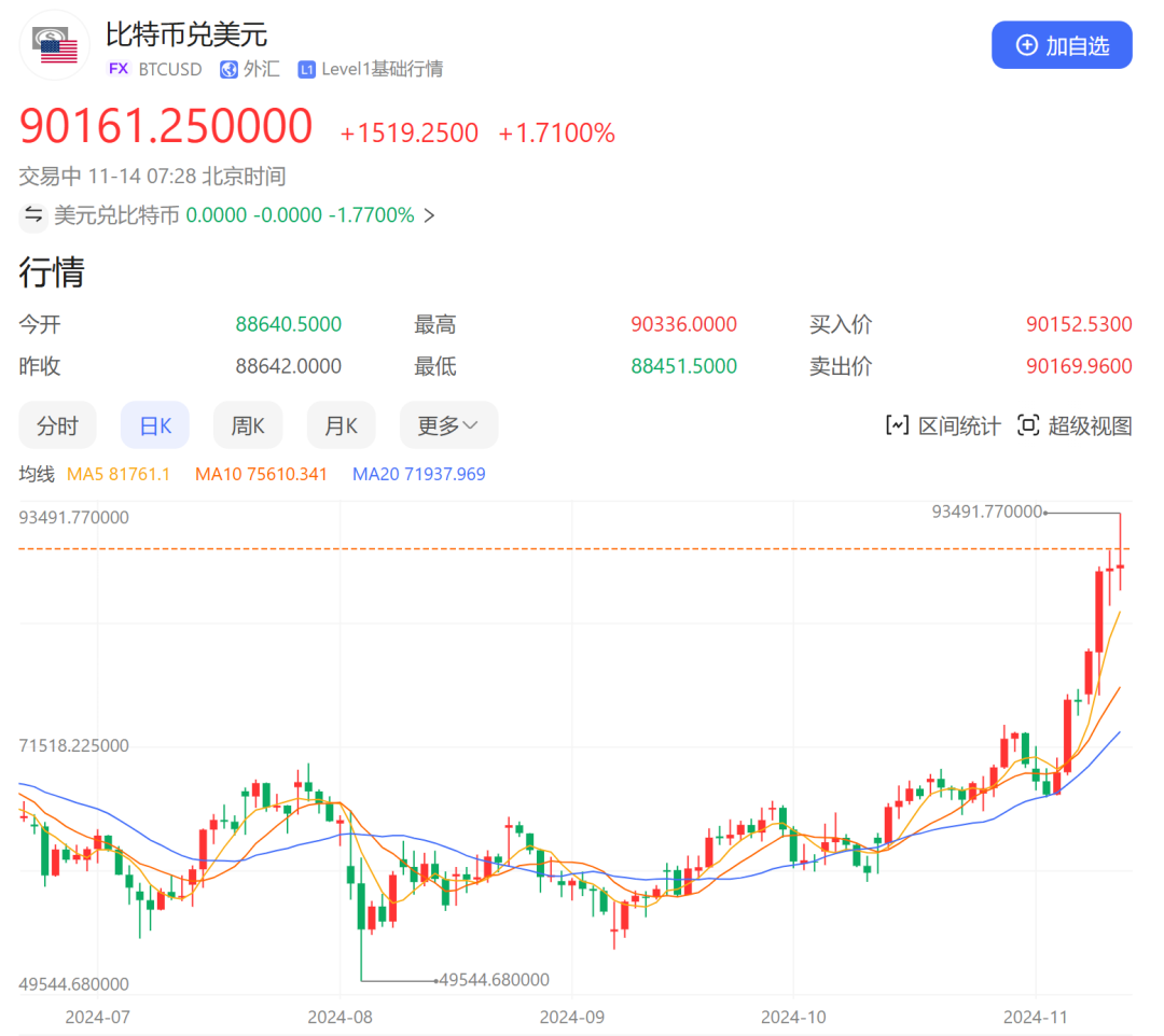 此外,比特币市场也迎来了重大突破。CPI数据公布后,比特币价格飙升,一度突破93000美元大关,创历史新高。然而,随后价格有所回落,但仍保持在9万美元之上。比特币在全球大类资产中的排名也上升至第8位,全球加密货币市值日内上涨1.5%,突破3.1万亿美元。