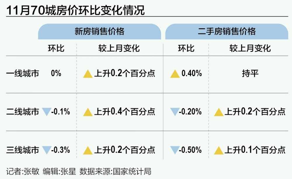 受此影响,楼市价格也有所升温。11月,全国70个大中城市中,有17个城市的新房价格环比上涨,10个城市的二手房价格环比上涨,均创下阶段性高点。其中,一线城市二手住宅销售价格环比上涨0.4%,已连续两个月保持正增长。