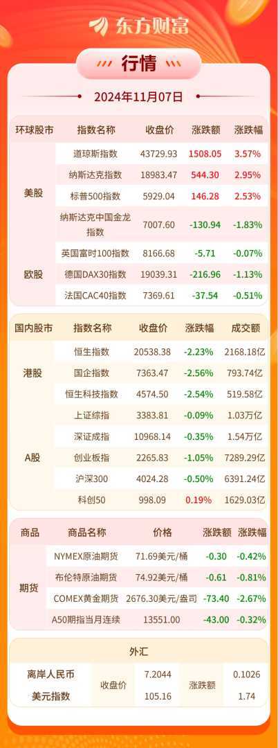 美股市场动态:美股市场再度展现强劲势头,三大指数均刷新历史新高。道琼斯工业平均指数大幅攀升,较前一交易日上涨1508.05点,收于43729.93点,涨幅高达3.57%;标准普尔500种股票指数与纳斯达克综合指数同样表现不俗,分别上涨146.28点和544.30点,收于5929.04点和18983.47点,涨幅分别为2.53%和2.95%。据新华网报道,特朗普赢得总统选举,共和党成功控制参议院,受此消息影响,“特朗普概念股”普遍上涨,其中特朗普媒体科技集团涨幅接近6%,特斯拉更是大涨超14%,创下2023年7月以来新高。特斯拉的大涨使得其创始人兼CEO马斯克的身家单日增长了209亿美元,总资产飙升至2856亿美元,稳居全球富豪榜首位。