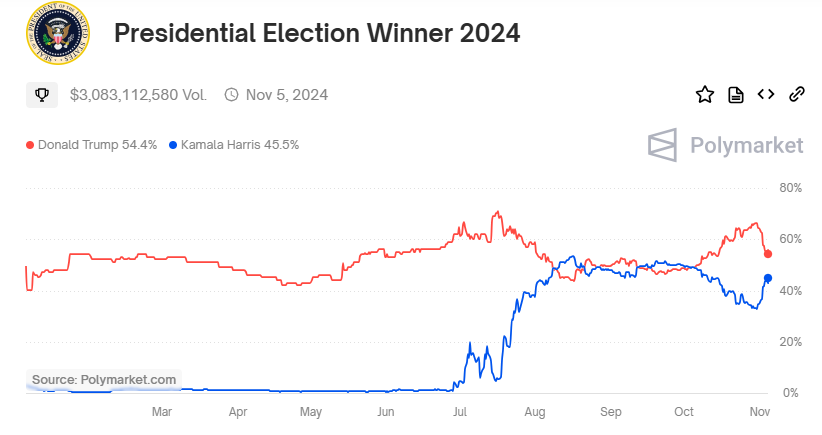 根据Polymarket平台最新数据显示,特朗普赢得今年大选的概率已降至54.5%,而哈里斯的胜率则迅速上升至45.5%。值得注意的是,上周五特朗普的胜率还高达63.2%。