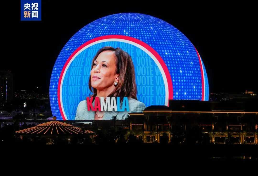哈里斯团队在拉斯韦加斯地标建筑外墙投放的巨幅广告。