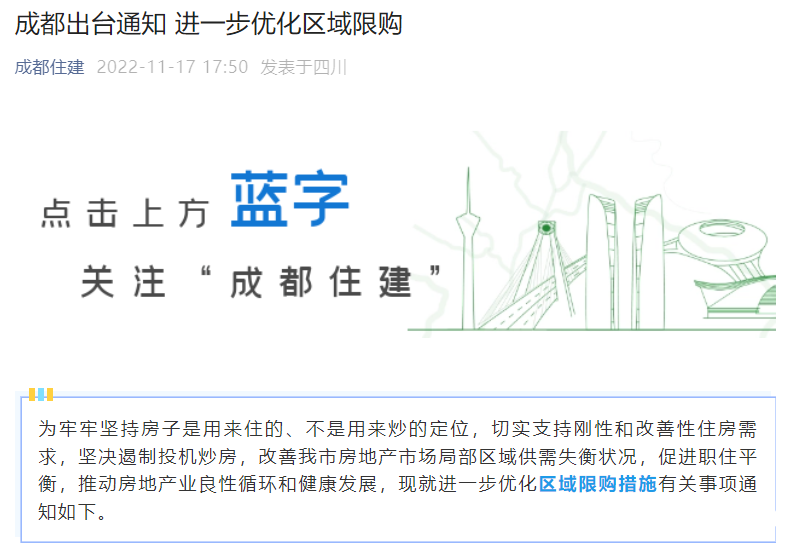 11月17日,四川省成都市连续发布两项通知,对区域限购政策进行了优化,并对商品住房公证摇号排序选房机制进行了完善,新政自2022年11月18日起正式施行。