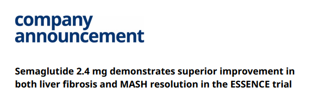 诺和诺德公布了一项Ⅲ期临床试验的第一阶段结果,显示2.4毫克的司美格鲁肽对肝纤维化和MASH的消退有显著改善,预计将于2025年上半年提交监管批准。