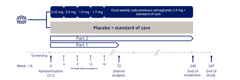 诺和诺德的“ESSENCE”试验是一项关键的Ⅲ期、为期240周的双盲试验,共涉及1,200名患有MASH和中度至晚期肝纤维化的成年人。这些参与者在标准治疗的基础上,按2:1的比例被分为2.4mg司美格鲁肽组和安慰剂组。
