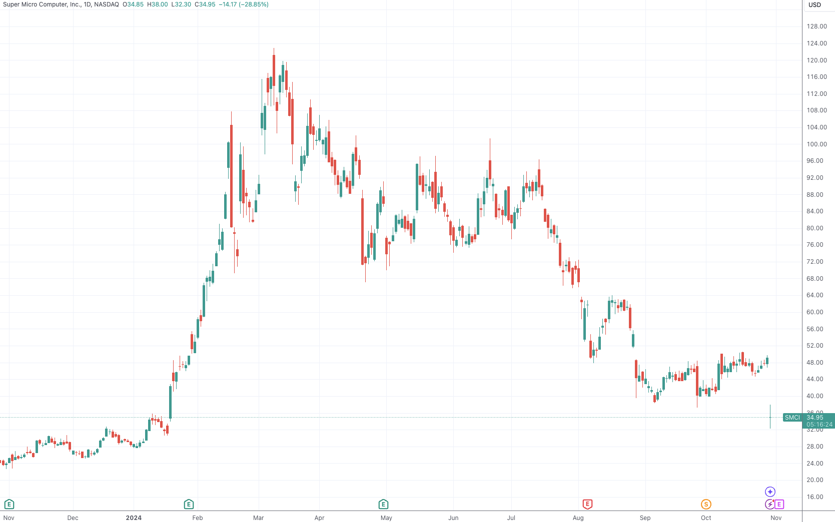 周三,美股市场开盘后,知名人工智能服务器生产商超微电脑(SMCI)股价遭遇重创,开盘即跳水超过30%,并连带拖累半导体板块中的多家巨头企业股价走弱。截至收盘,超微电脑股价暴跌32.67%,报收于33.07美元。