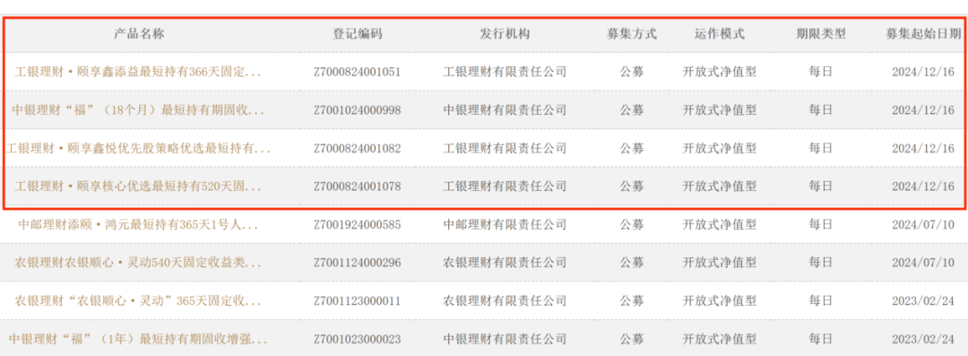 具体来看,工银理财推出的3款新品均属于“颐享”系列开放式理财产品,分别设置了366天、500天、520天的最短持有期,以满足投资者多样化的养老规划需求。这些产品均通过工商银行代销,自12月16日起面向全国发售。